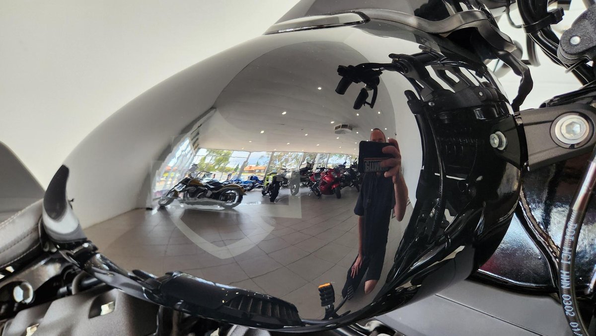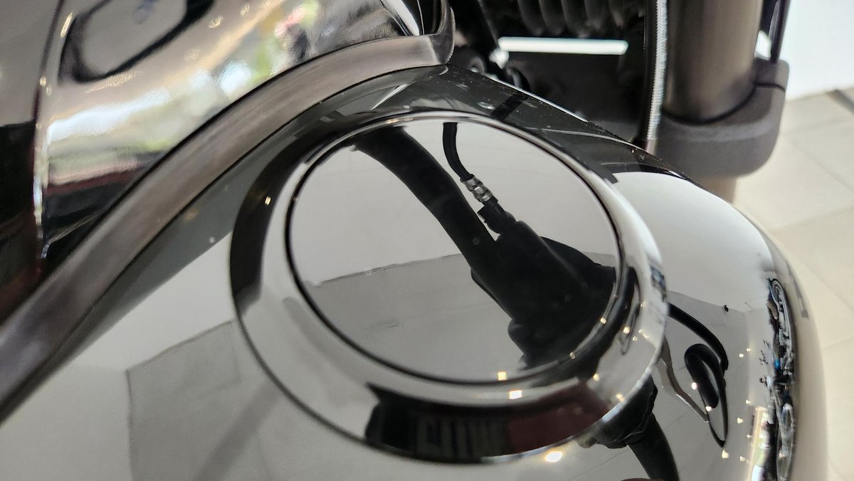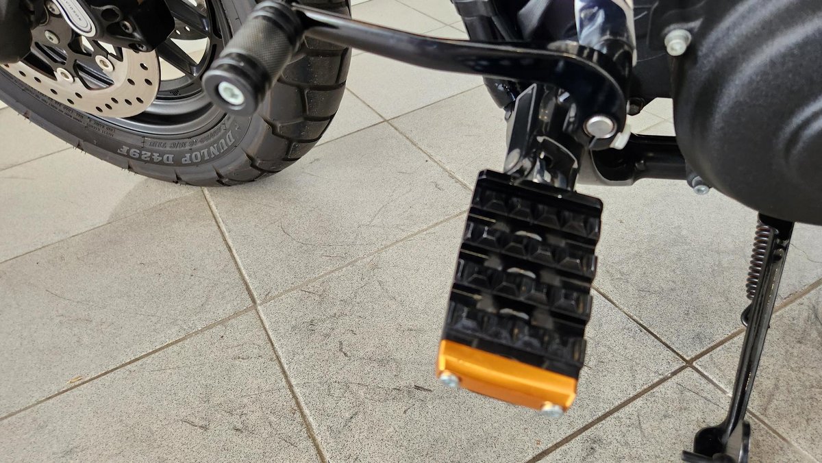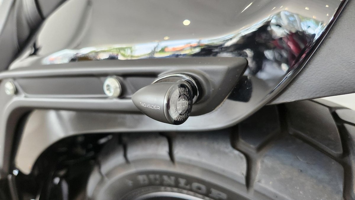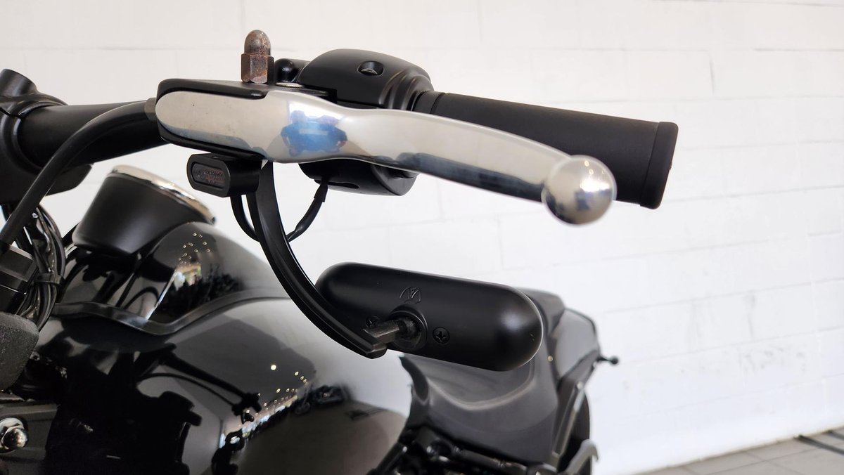Styling: Characterised by its blunt, squared-off LED headlight, upswept 2-1-2 exhaust, and aggressive stance defined by fat tyres (150mm front/180mm rear) and drag-style handlebars.