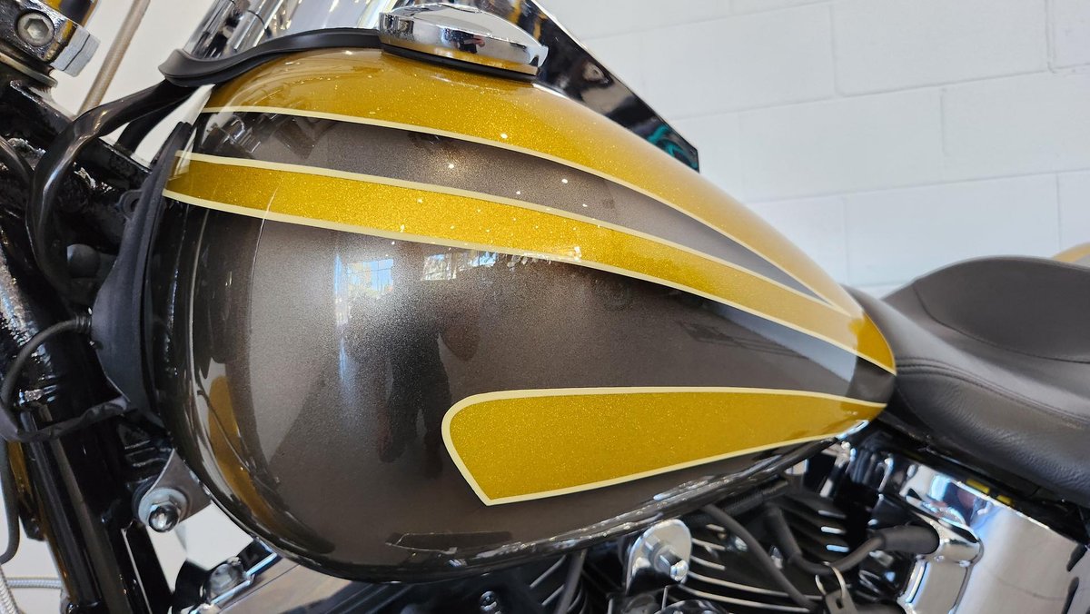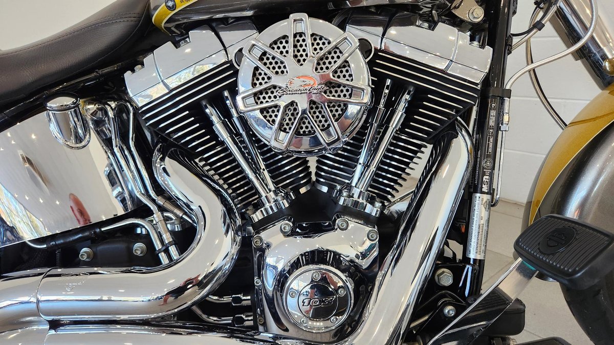 Built on a rugged Softail frame with hidden rear suspension and front "beer-can" forks, it balances plush comfort with stability