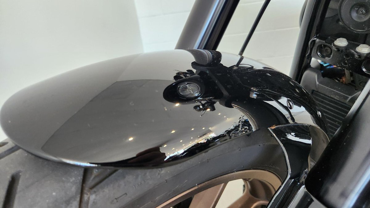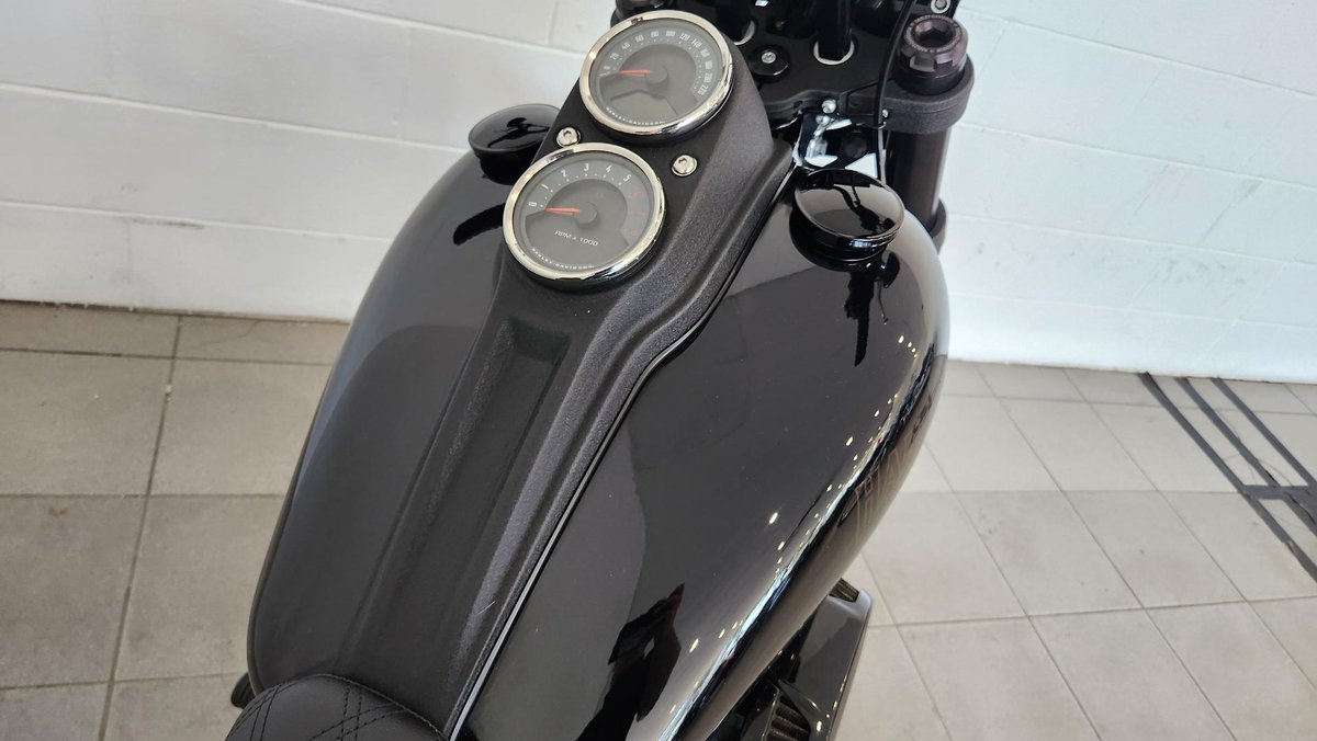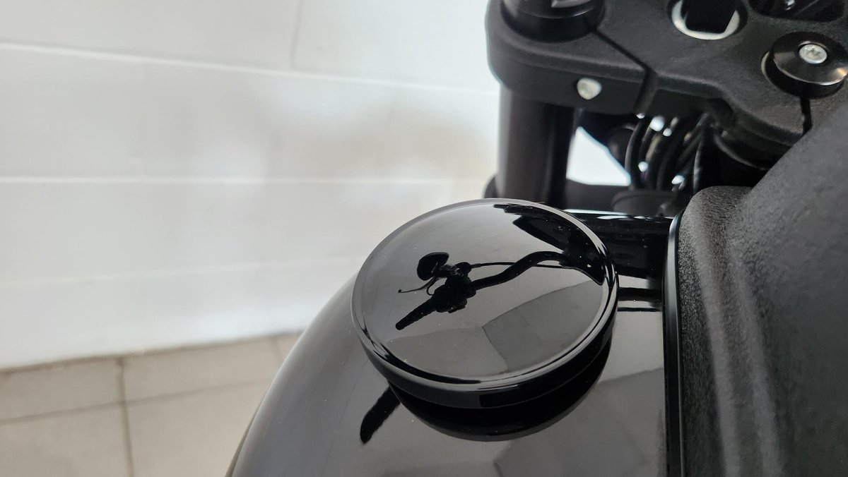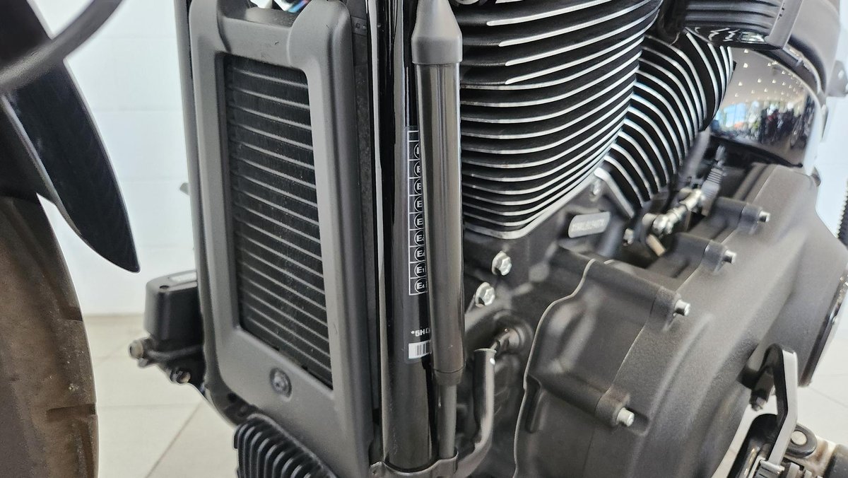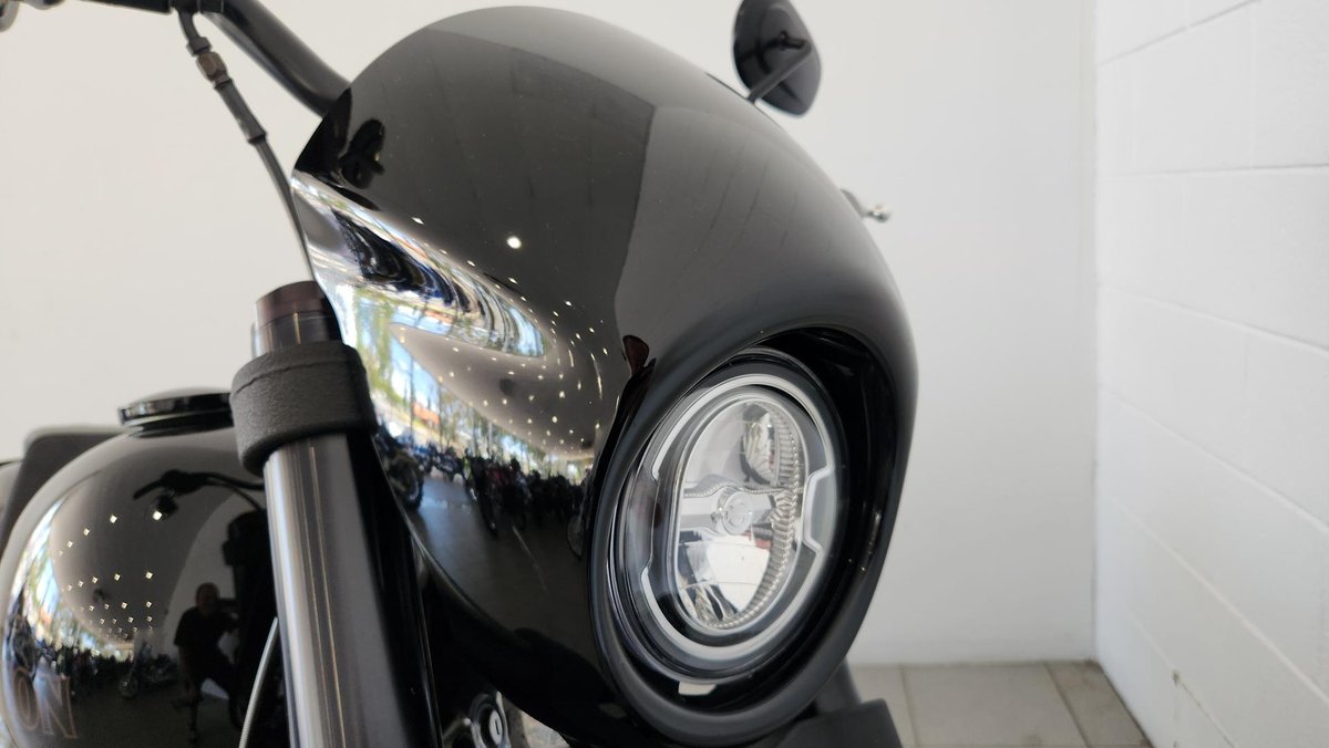 Aggressive Styling: It embodies a "coastal custom" look with a predominantly blacked-out finish on the powertrain, exhaust, and components, 4-inch handlebar risers holding moto-style bars, a minimal speed screen/fairing, a solo seat, and unique matte dark bronze cast-aluminum "Radiate" wheels.