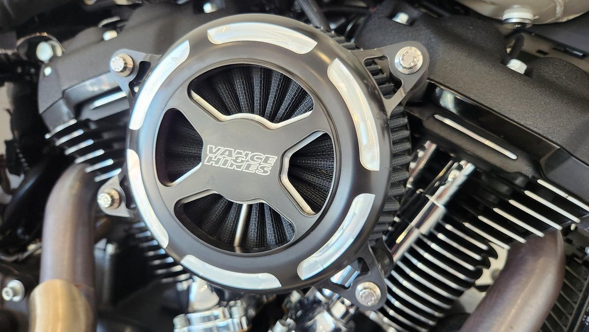 Outfitted with a throaty 2-into-1 TBR exhaust, this girl now roars like thunder on demand, blasting deep, snarling tones that announce your arrival before your silhouette even hits the horizon. Add Vitys adjustable Billet bar risers and high-rise Thrashin’ Supply Co. bars, and the cockpit becomes a cockpit of pure command — upright, aggressive, and ready to flick this H-D into corners with swagger. Throw in a Vance & Hines VO2 X air filter and the engine breathes deeper, pulling harder and smoother with every twist. The look gets sharper — and the intake sings with life.