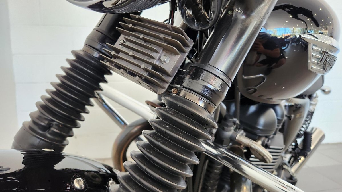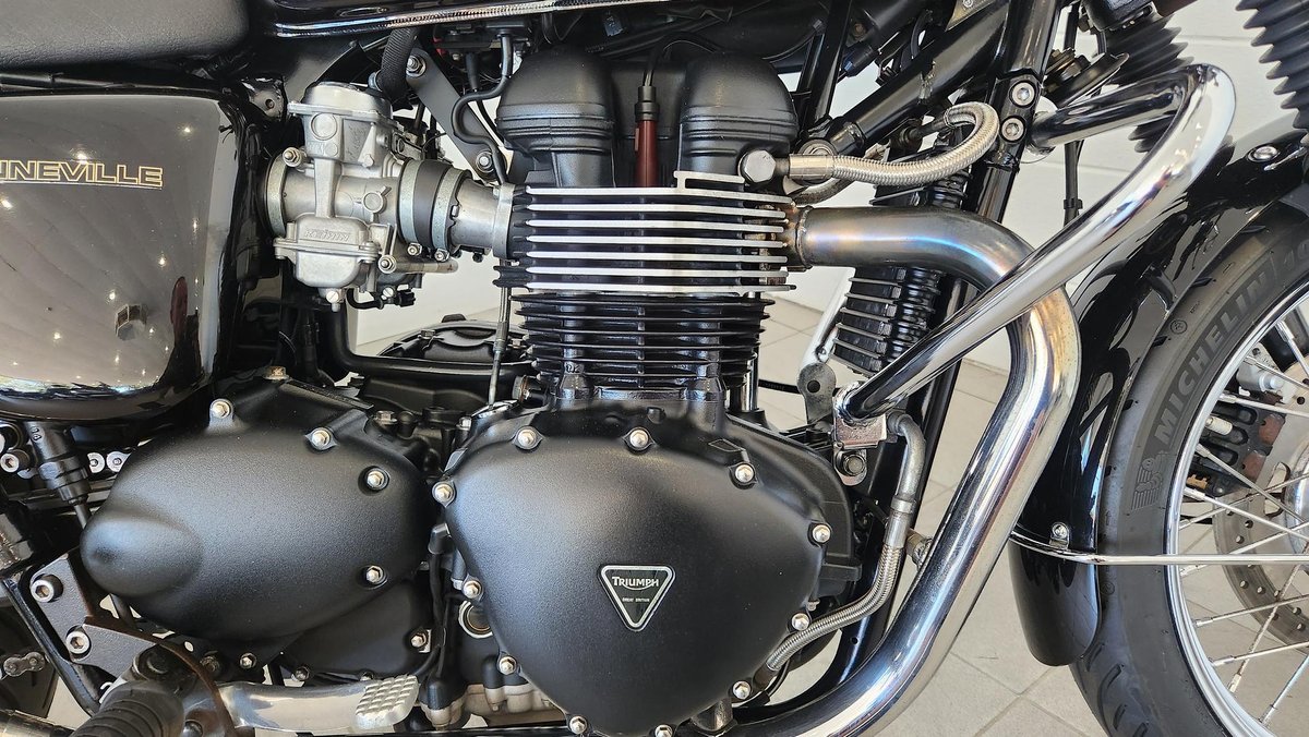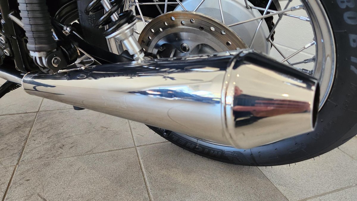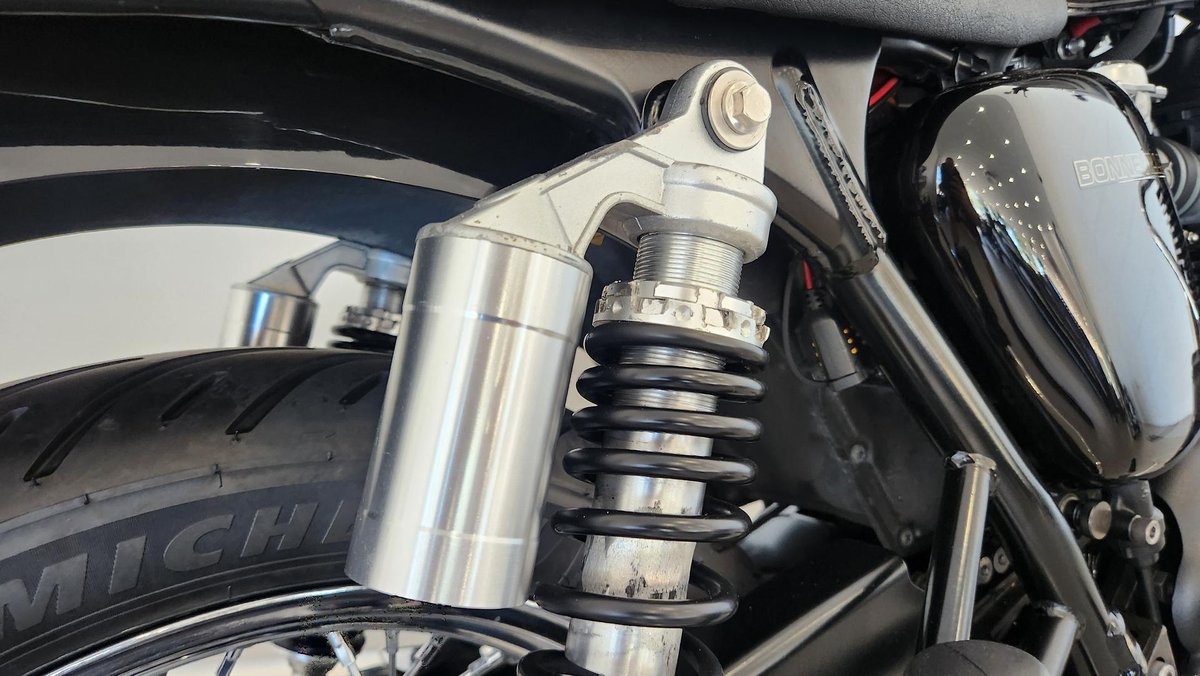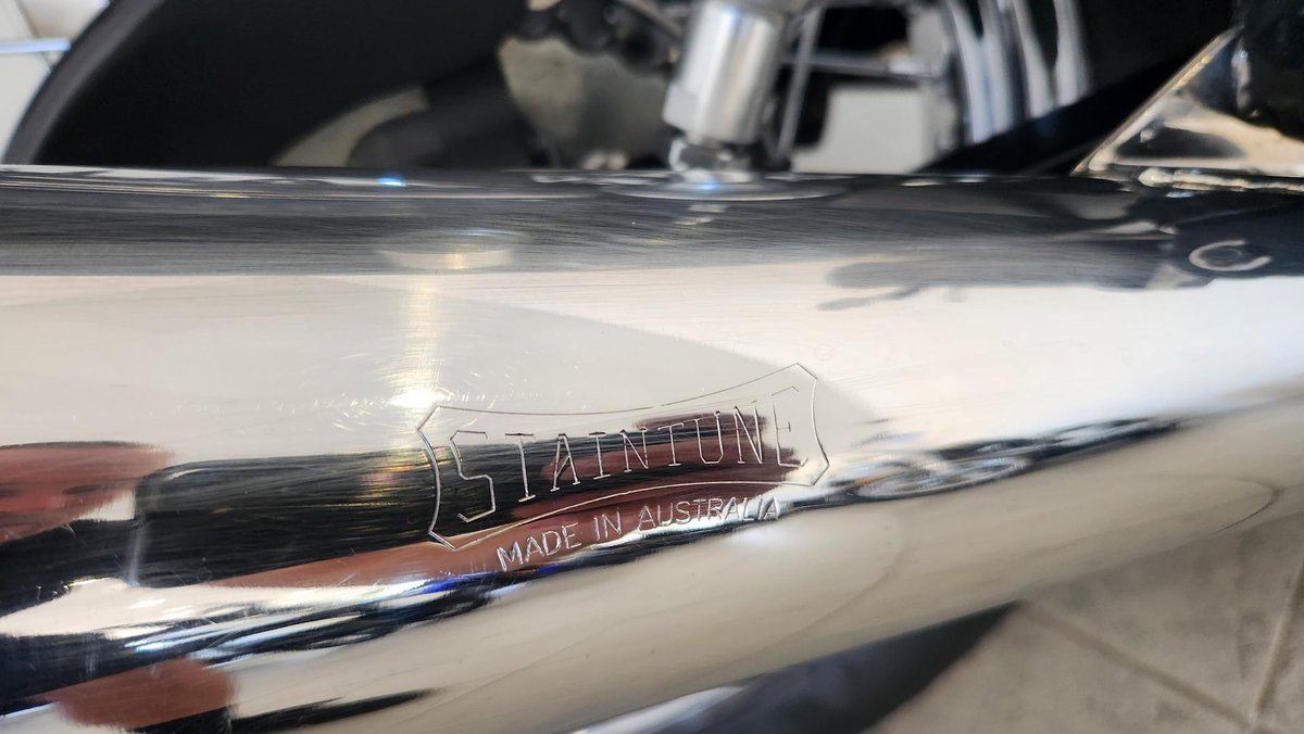 A standout feature on this particular Bonneville is the addition of Staintune reverse-cone mufflers. These hand-built stainless-steel silencers are a high-end aftermarket upgrade known for enhancing both sound and performance. With their reverse-cone design, the Staintune pipes give the Bonneville a richer, deeper exhaust note — louder and more characterful than stock — while subtly improving throttle response and midrange grunt. The polished stainless finish also complements the Bonneville’s vintage aesthetic beautifully, turning heads with both form and acoustics.