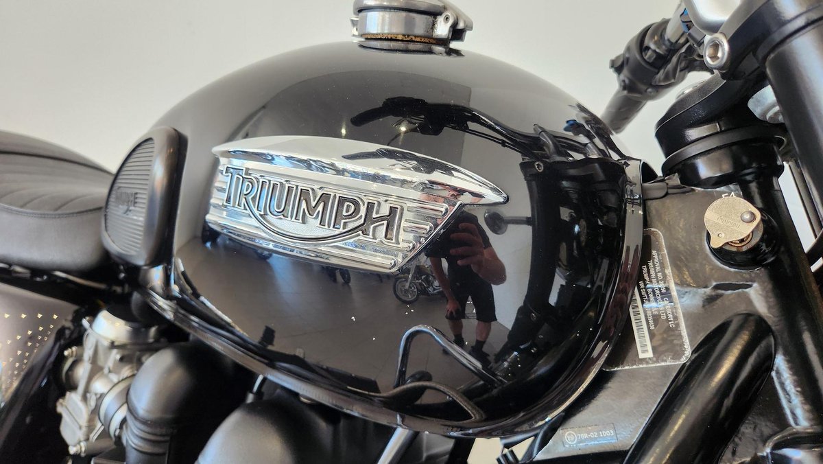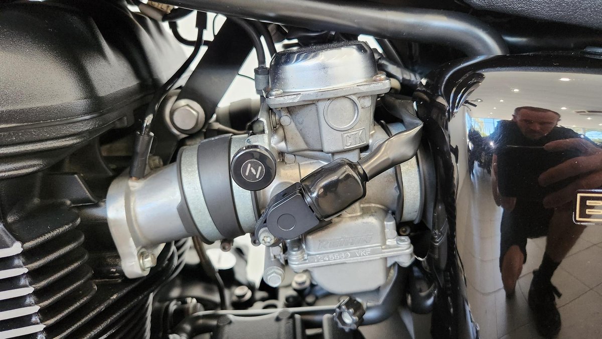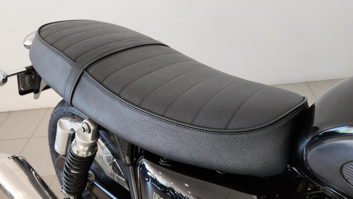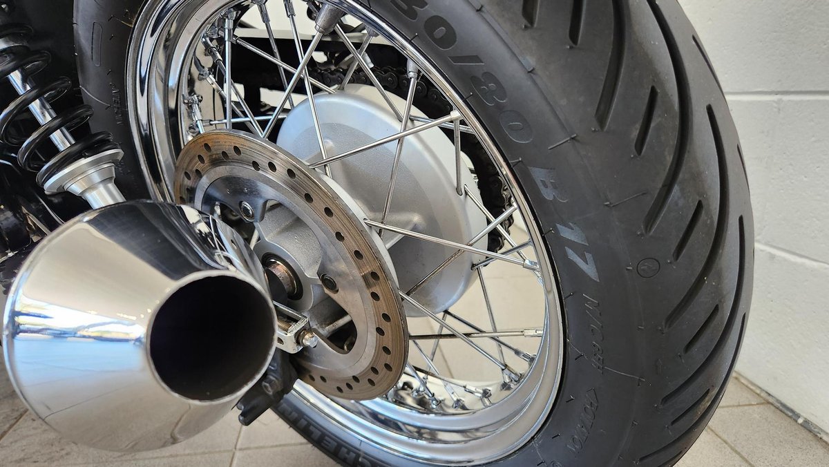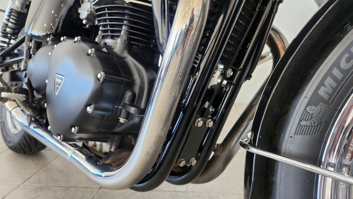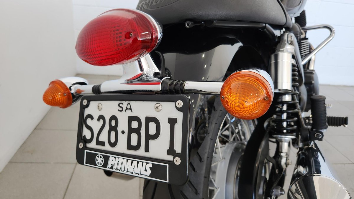 A standout feature on this particular Bonneville is the addition of Staintune reverse-cone mufflers. These hand-built stainless-steel silencers are a high-end aftermarket upgrade known for enhancing both sound and performance. With their reverse-cone design, the Staintune pipes give the Bonneville a richer, deeper exhaust note — louder and more characterful than stock — while subtly improving throttle response and midrange grunt. The polished stainless finish also complements the Bonneville’s vintage aesthetic beautifully, turning heads with both form and acoustics.