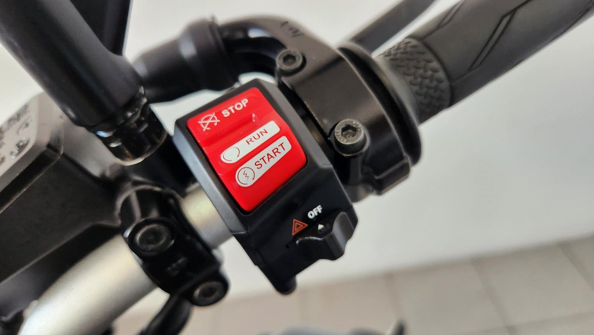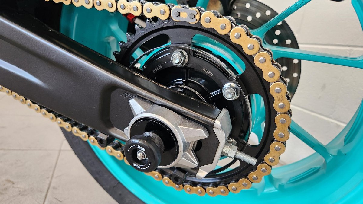 This example turns the intensity up a notch, fitted with a sleek fender eliminator that sharpens the rear profile and gives it that clean, streetfighter stance. The addition of a carbon Akrapovic exhaust unleashes a deeper, throatier growl, transforming every twist of the throttle into a symphony of performance.